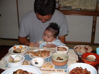 それから今月は『食い初め』をしたんだ。石は食べられないけどマネだけしたんだ。